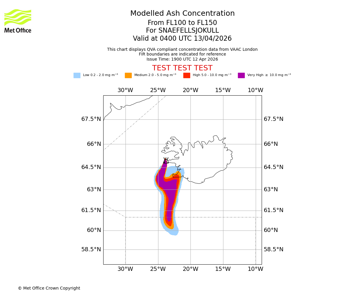 Modelled ash concentration from 100 to 150 for SNAEFELLSJOKULL. Valid at 0100 UTC 13/04/2026