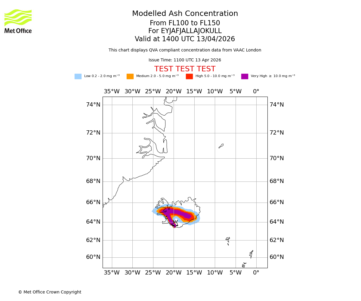Modelled ash concentration from 100 to 150 for EYJAFJALLAJOKULL. Valid at 1100 UTC 13/04/2026
