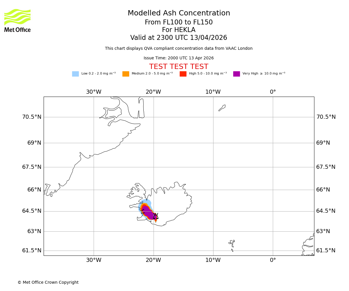 Modelled ash concentration from 100 to 150 for HEKLA. Valid at 2000 UTC 13/04/2026