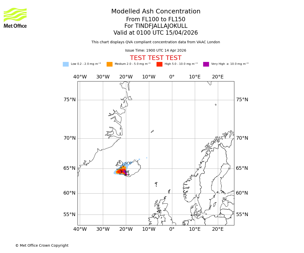 Modelled ash concentration from 100 to 150 for TINDFJALLAJOKULL. Valid at 2200 UTC 14/04/2026