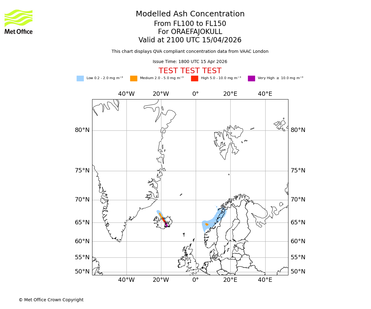 Modelled ash concentration from 100 to 150 for ORAEFAJOKULL. Valid at 1800 UTC 15/04/2026