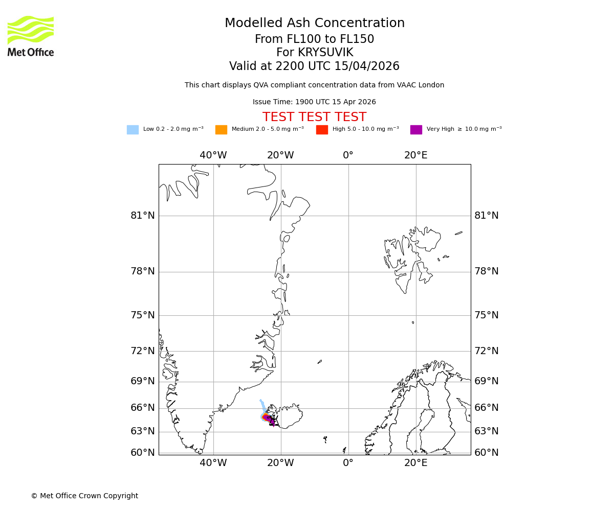 Modelled ash concentration from 100 to 150 for KRYSUVIK. Valid at 1900 UTC 15/04/2026
