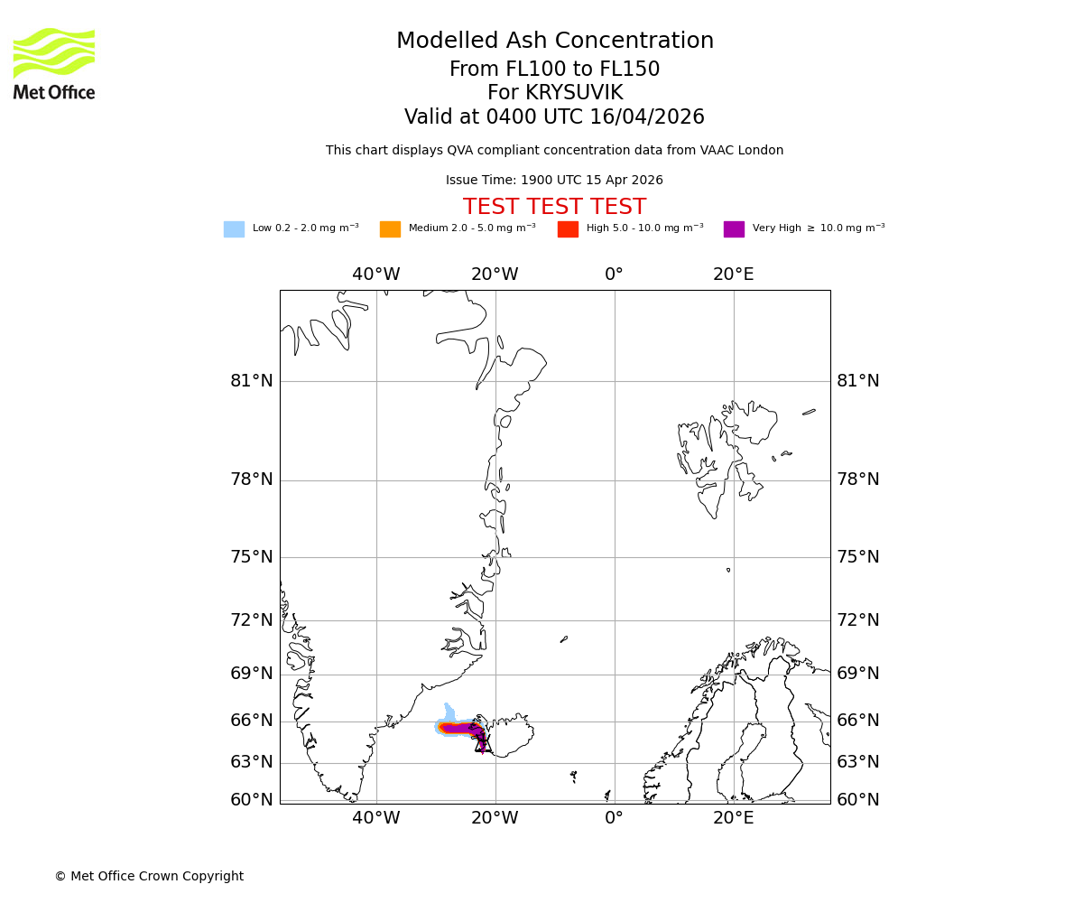Modelled ash concentration from 100 to 150 for KRYSUVIK. Valid at 0100 UTC 16/04/2026