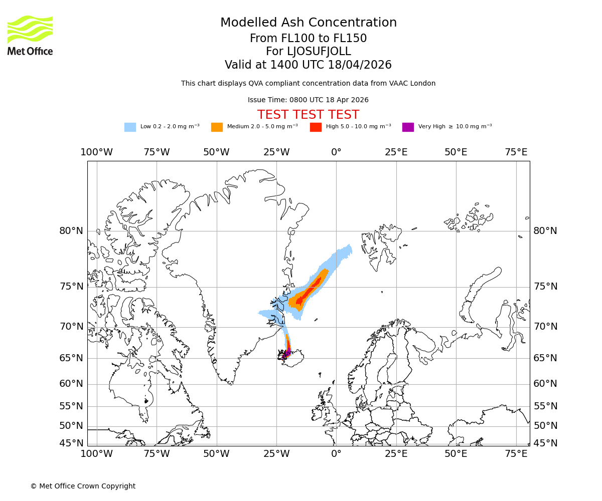 Modelled ash concentration from 100 to 150 for LJOSUFJOLL. Valid at 1100 UTC 18/04/2026