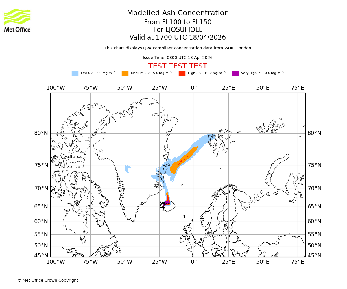 Modelled ash concentration from 100 to 150 for LJOSUFJOLL. Valid at 1400 UTC 18/04/2026