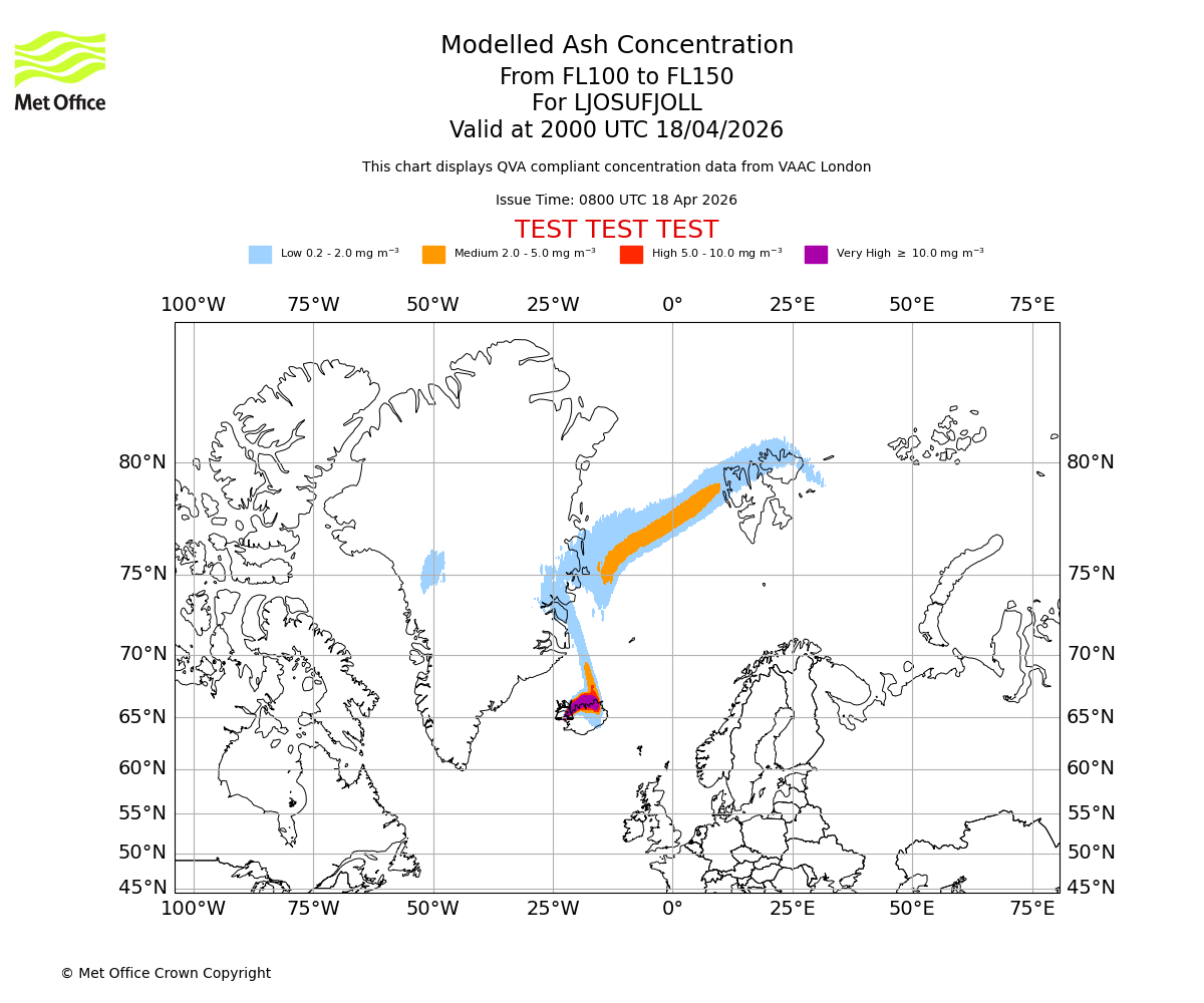 Modelled ash concentration from 000 to 200 for LJOSUFJOLL. Valid at 0800 UTC 18/04/2026