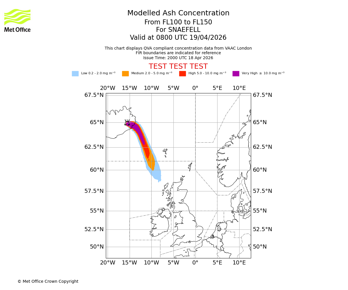Modelled ash concentration from 100 to 150 for SNAEFELL. Valid at 0500 UTC 19/04/2026