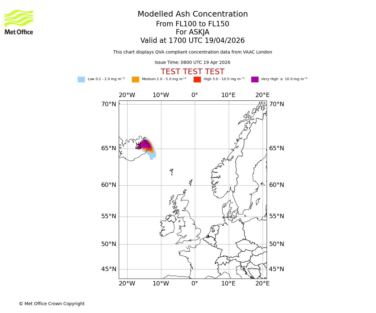 Modelled ash concentration from 100 to 150 for ASKJA. Valid at 1400 UTC 19/04/2026