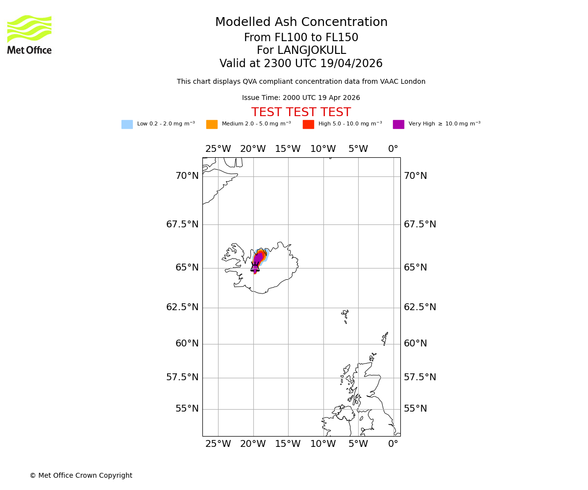 Modelled ash concentration from 100 to 150 for LANGJOKULL. Valid at 2000 UTC 19/04/2026