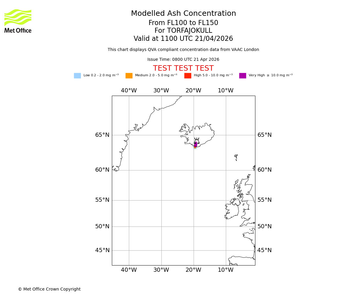 Modelled ash concentration from 100 to 150 for TORFAJOKULL. Valid at 0800 UTC 21/04/2026