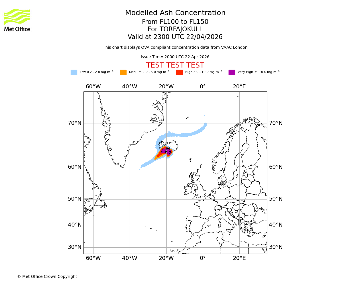 Modelled ash concentration from 100 to 150 for TORFAJOKULL. Valid at 2000 UTC 22/04/2026
