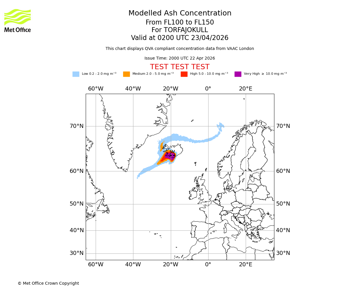 Modelled ash concentration from 100 to 150 for TORFAJOKULL. Valid at 2300 UTC 22/04/2026