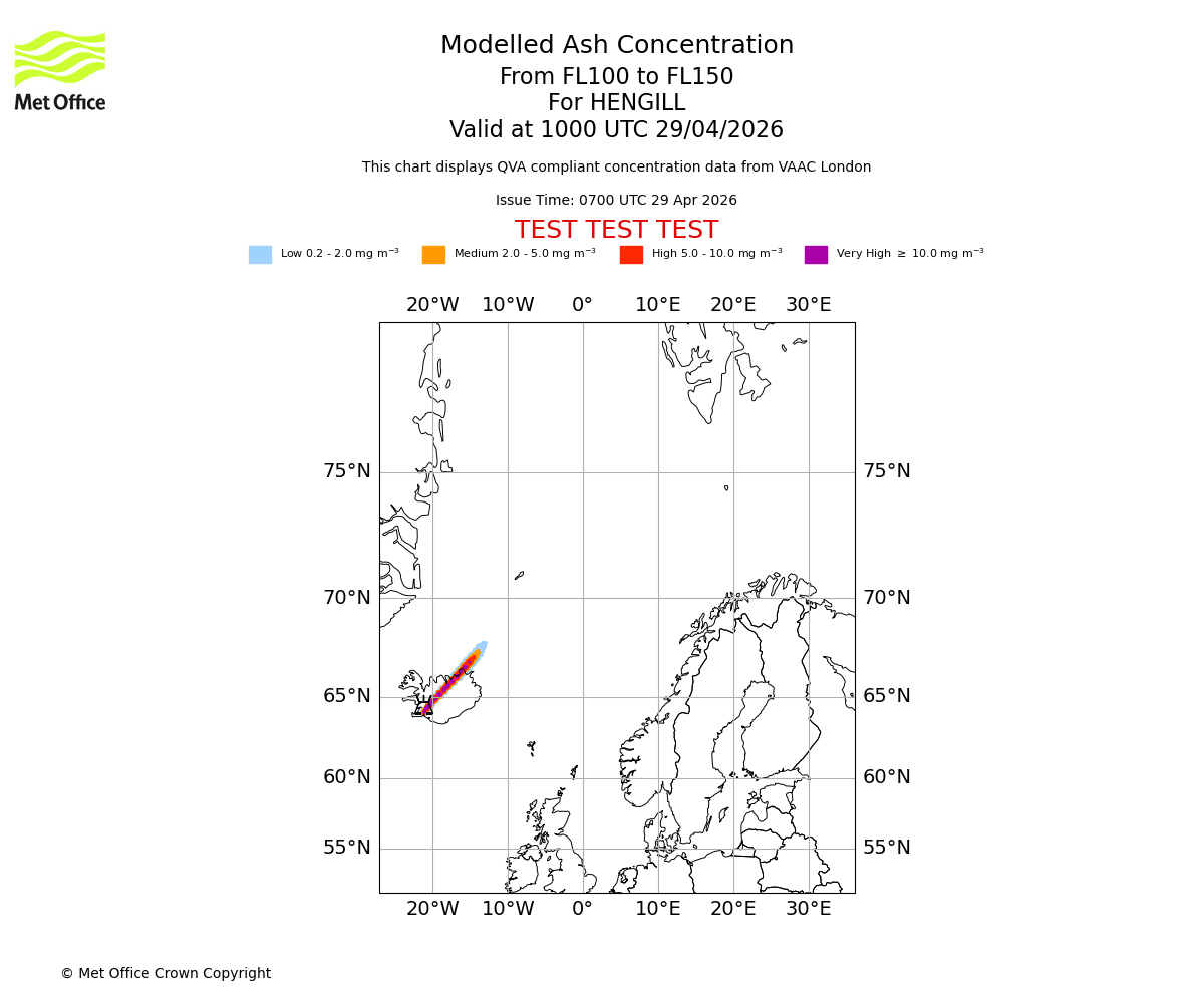 Modelled ash concentration from 100 to 150 for HENGILL. Valid at 0700 UTC 29/04/2026