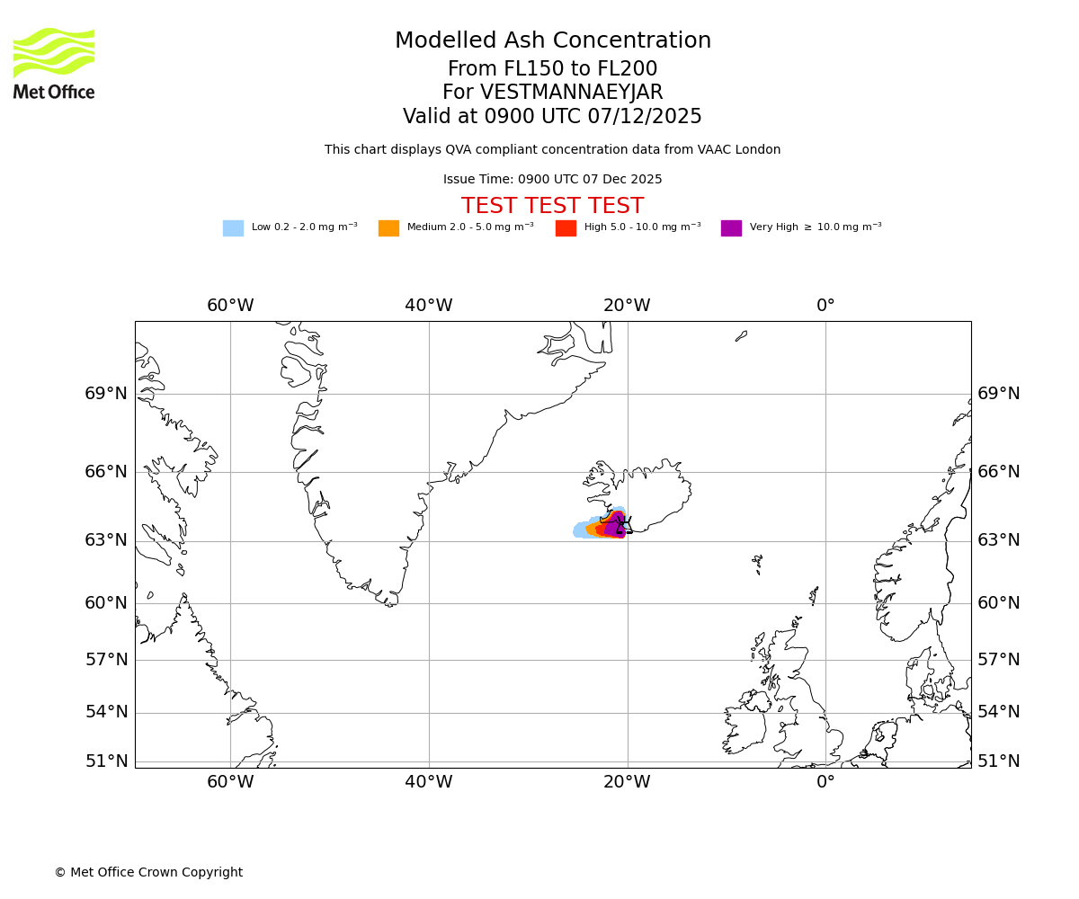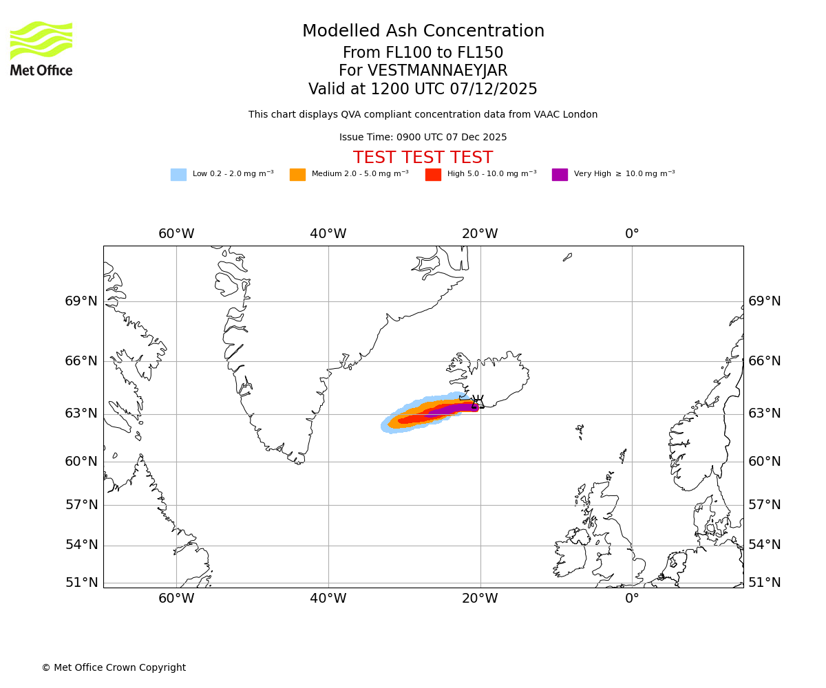 Modelled ash concentration from 100 to 150 for VESTMANNAEYJAR. Valid at 0900 UTC 07/12/2025