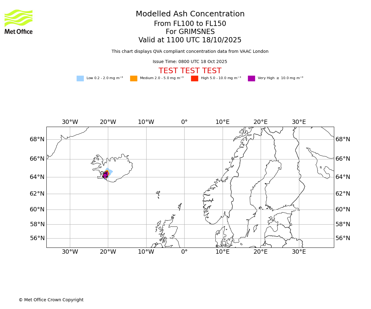 Modelled ash concentration from 100 to 150 for GRIMSNES. Valid at 0800 UTC 18/10/2025