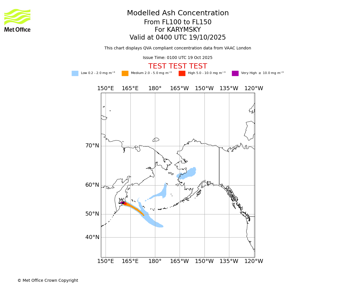 Modelled ash concentration from 100 to 150 for KARYMSKY. Valid at 0100 UTC 19/10/2025