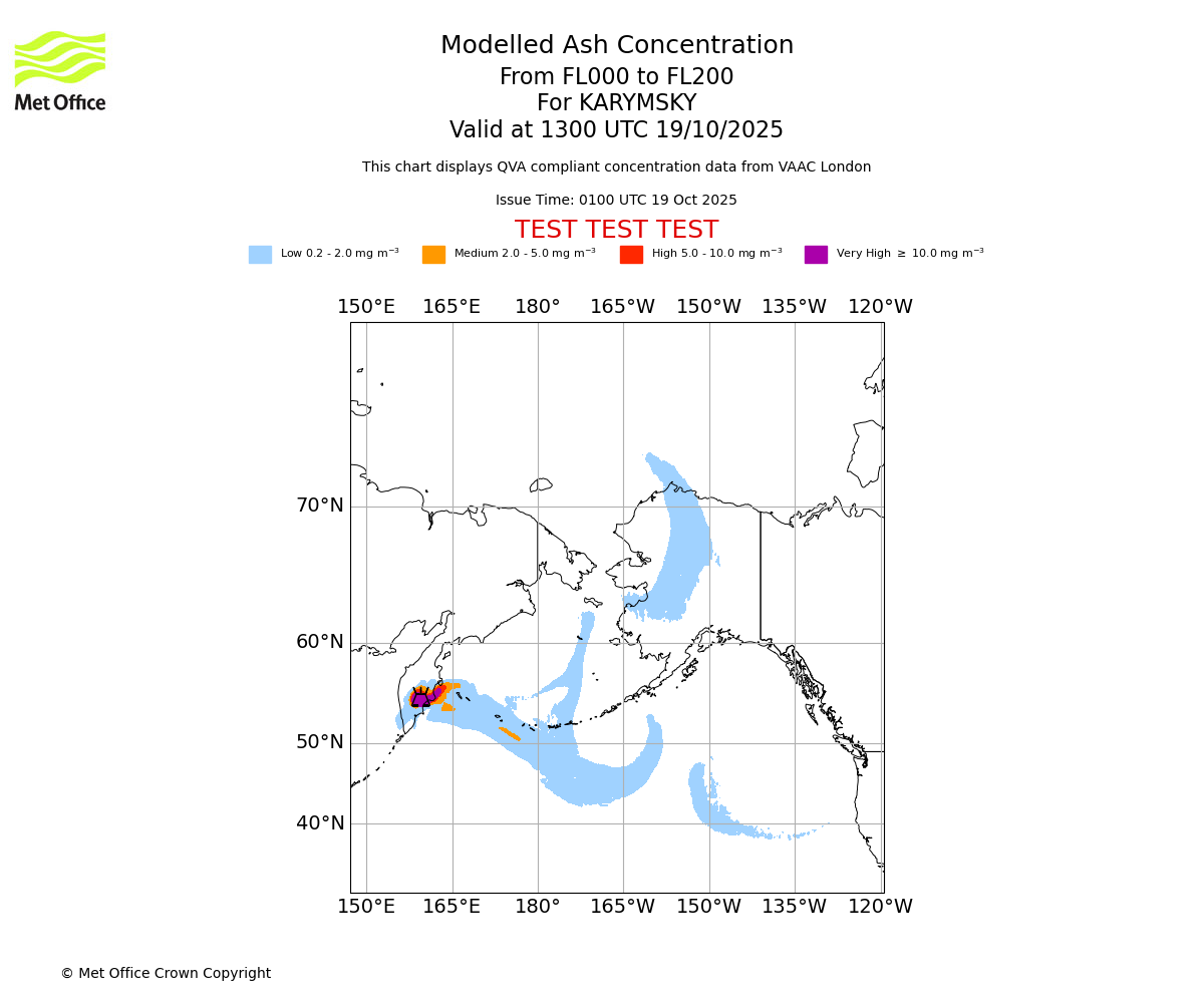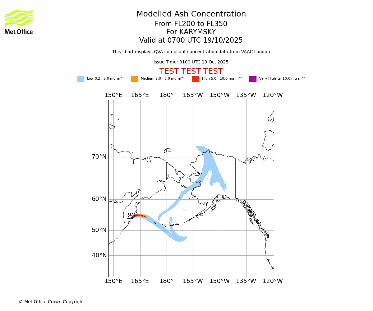 Modelled ash concentration from 000 to 200 for KARYMSKY. Valid at 0700 UTC 19/10/2025