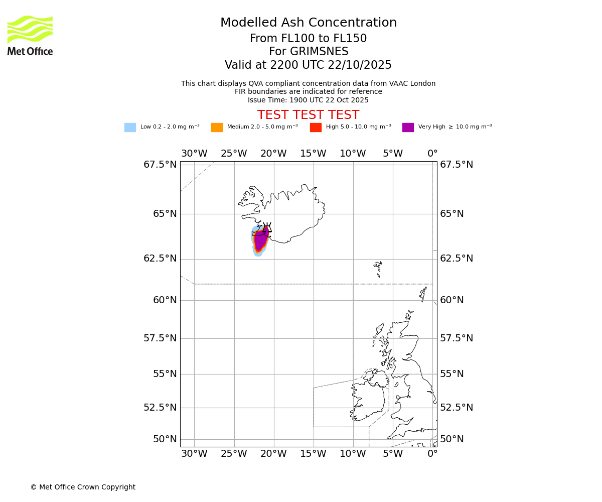 Modelled ash concentration from 100 to 150 for GRIMSNES. Valid at 1900 UTC 22/10/2025