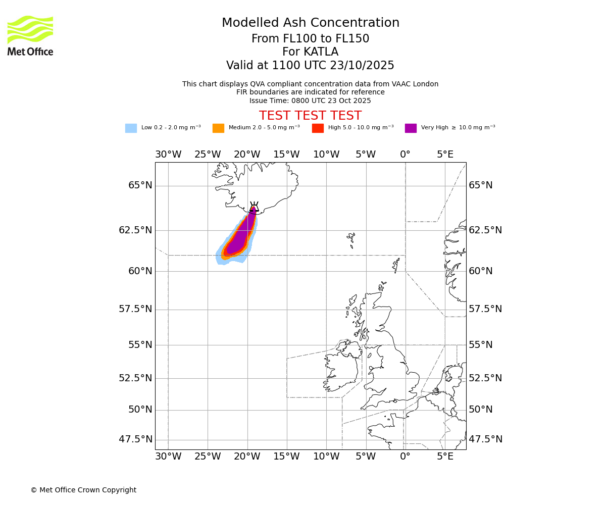 Modelled ash concentration from 100 to 150 for KATLA. Valid at 0800 UTC 23/10/2025