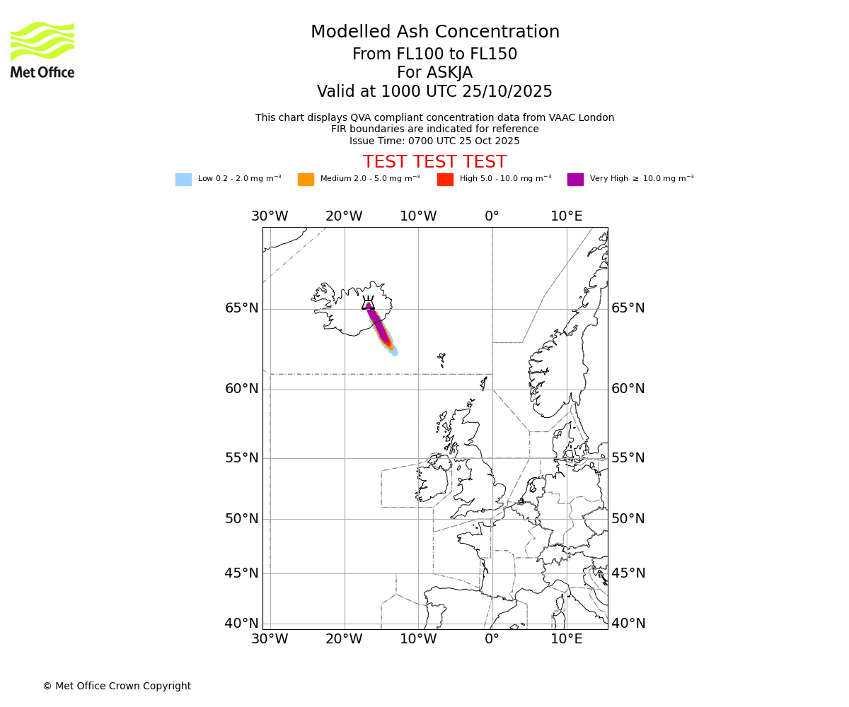 Modelled ash concentration from 100 to 150 for ASKJA. Valid at 0700 UTC 25/10/2025