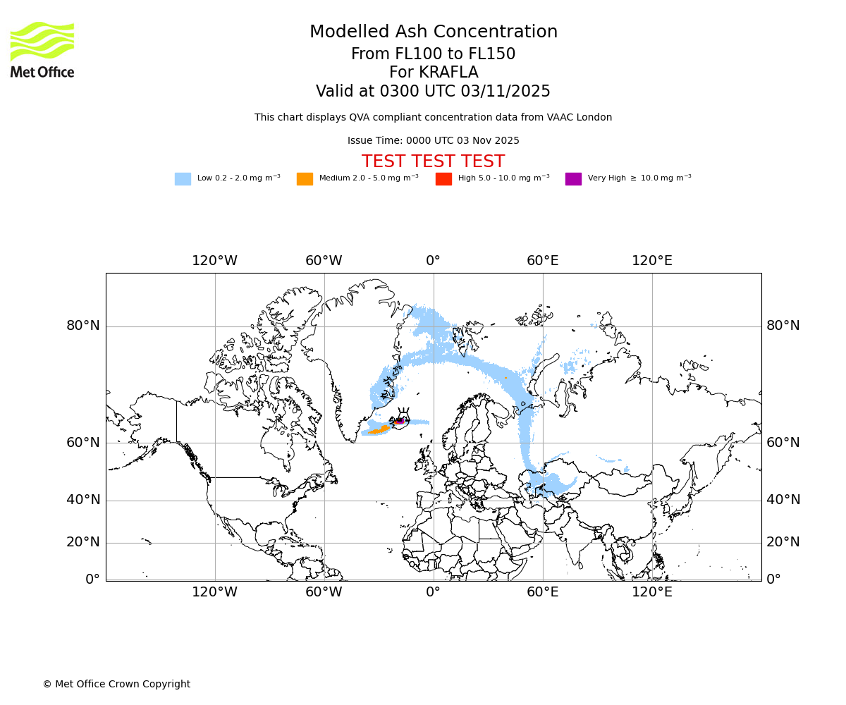 Modelled ash concentration from 100 to 150 for KRAFLA. Valid at 0000 UTC 03/11/2025