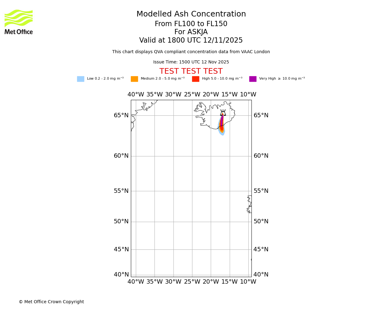 Modelled ash concentration from 100 to 150 for ASKJA. Valid at 1500 UTC 12/11/2025
