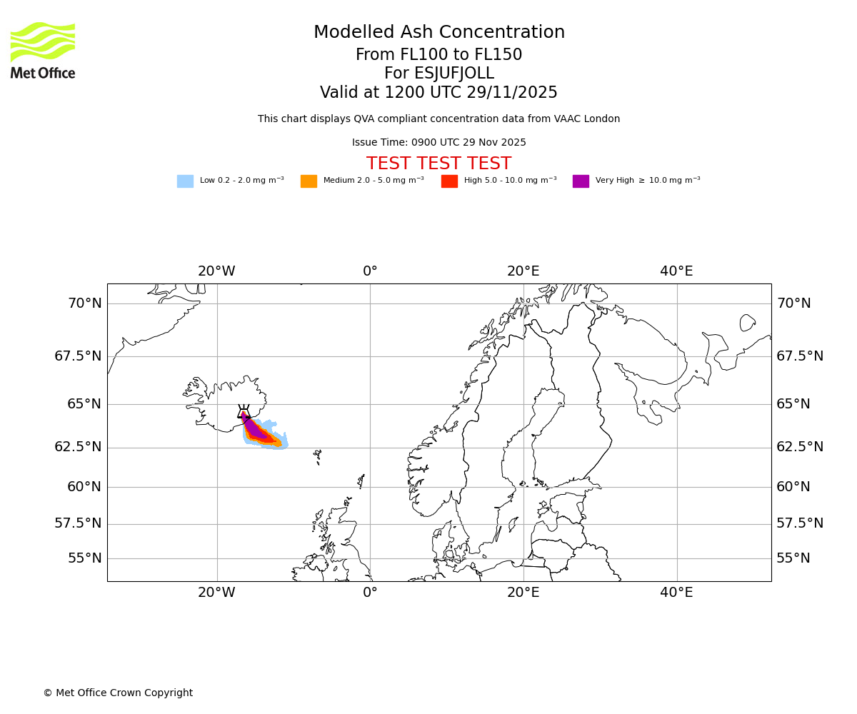 Modelled ash concentration from 100 to 150 for ESJUFJOLL. Valid at 0900 UTC 29/11/2025