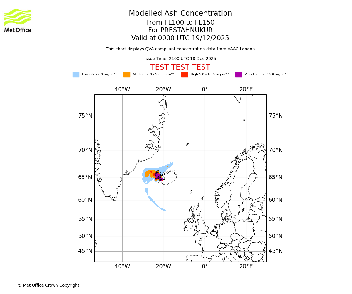 Modelled ash concentration from 100 to 150 for PRESTAHNUKUR. Valid at 2100 UTC 18/12/2025