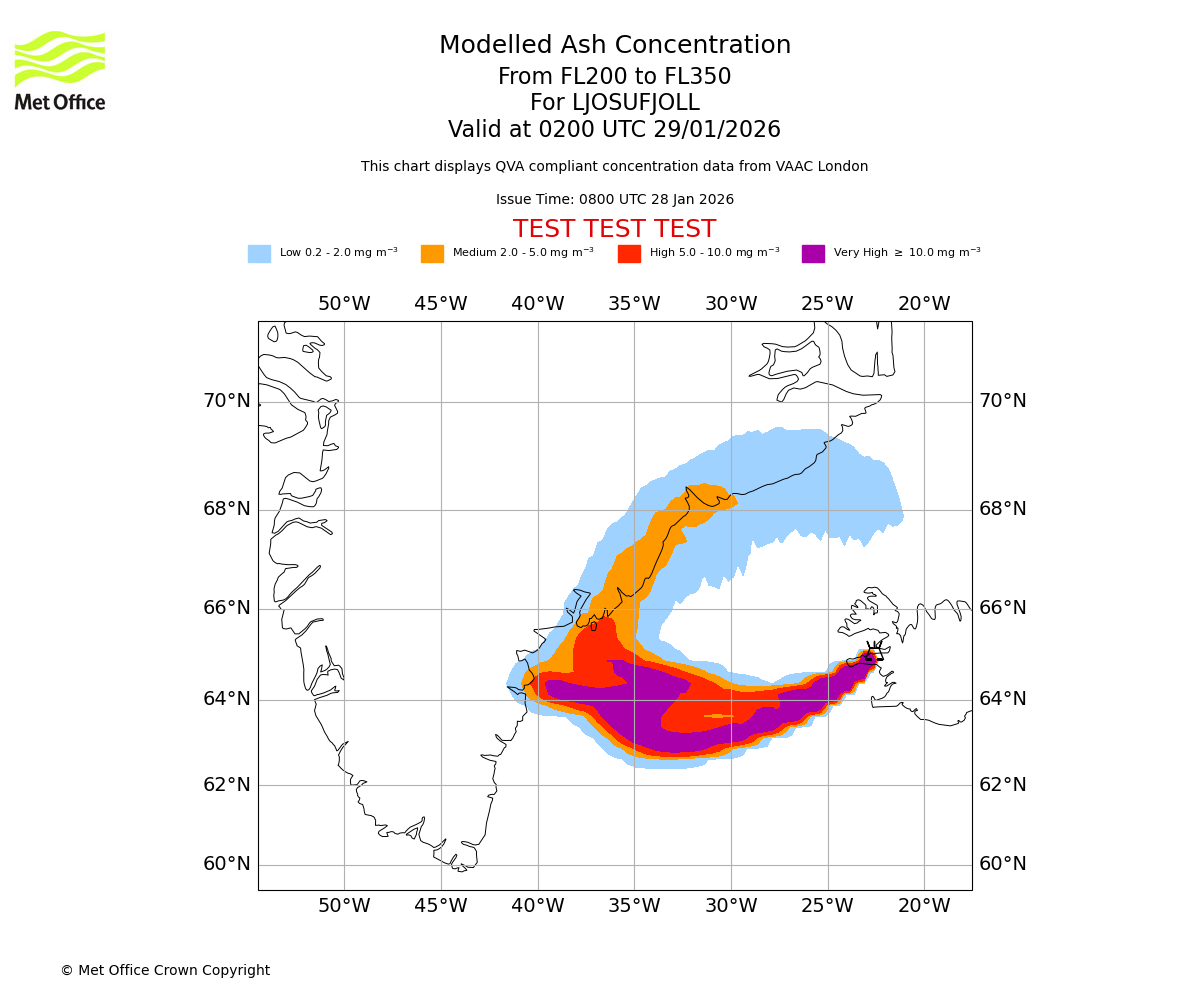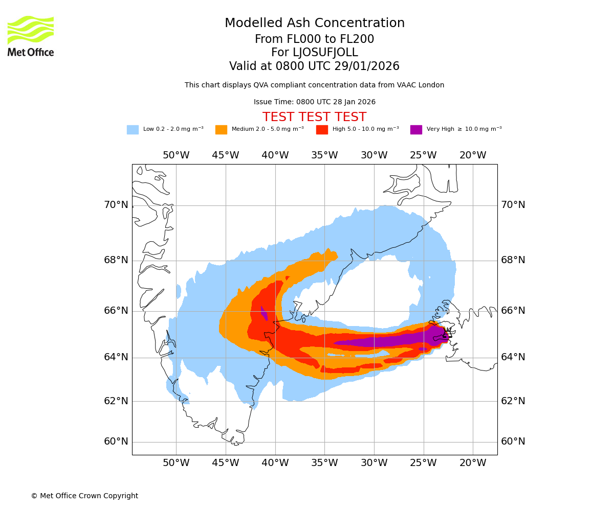 Modelled ash concentration from 000 to 200 for LJOSUFJOLL. Valid at 0200 UTC 29/01/2026