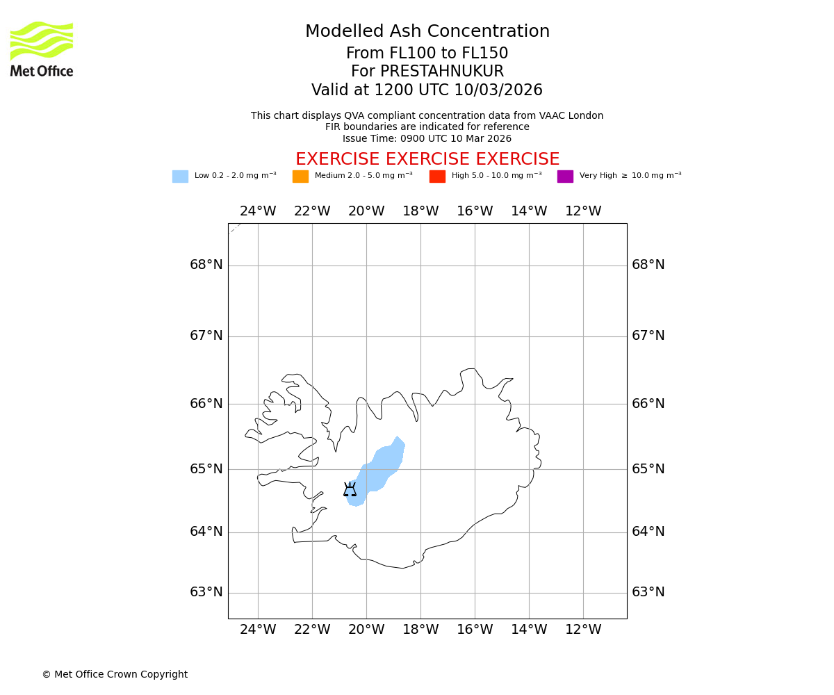 Modelled ash concentration from 100 to 150 for PRESTAHNUKUR. Valid at 0900 UTC 10/03/2026