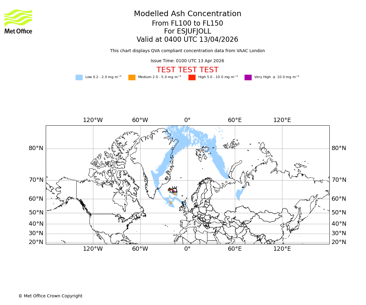 Modelled ash concentration from 100 to 150 for ESJUFJOLL. Valid at 0100 UTC 13/04/2026