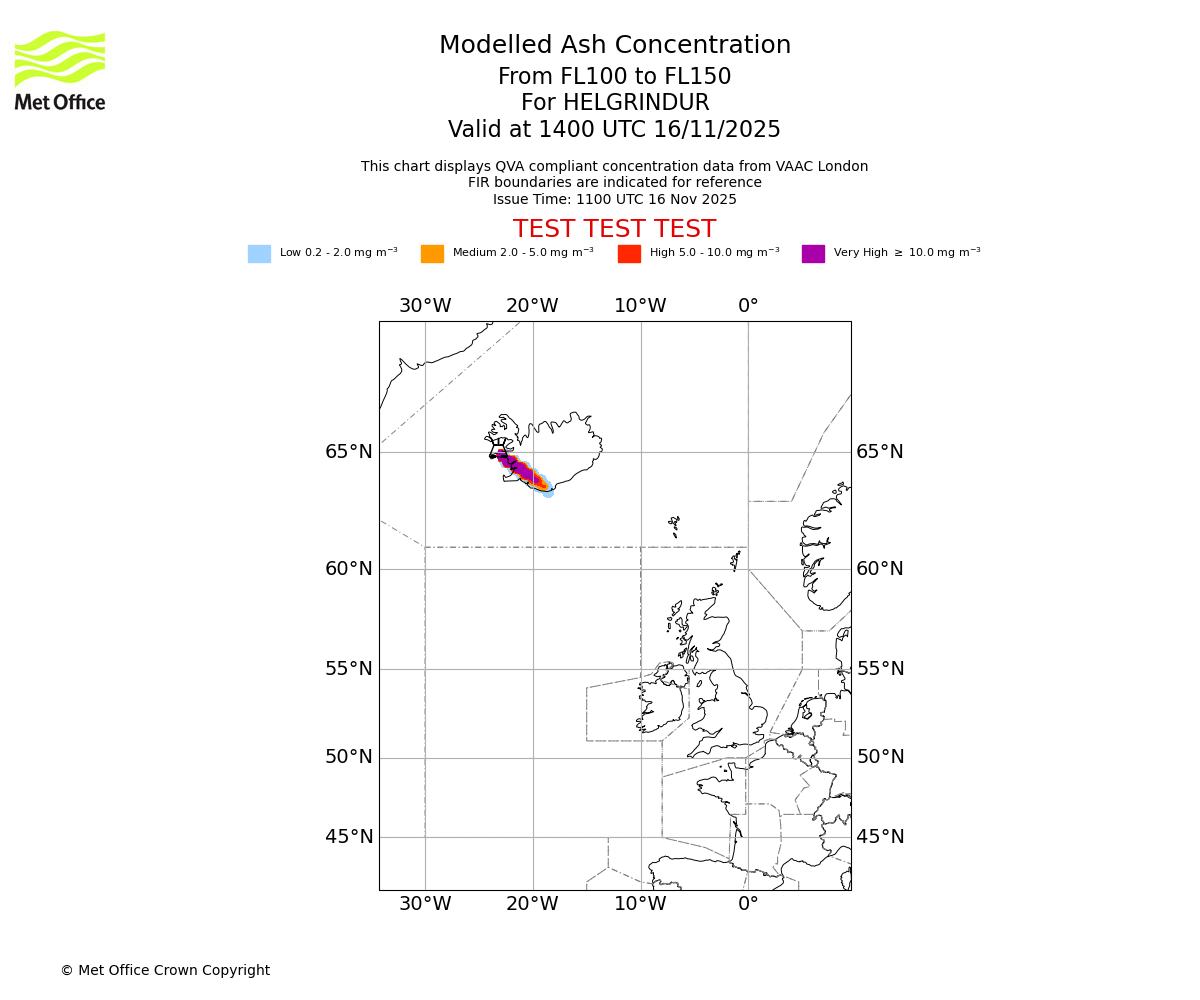 Modelled ash concentration from 100 to 150 for HELGRINDUR. Valid at 1100 UTC 16/11/2025