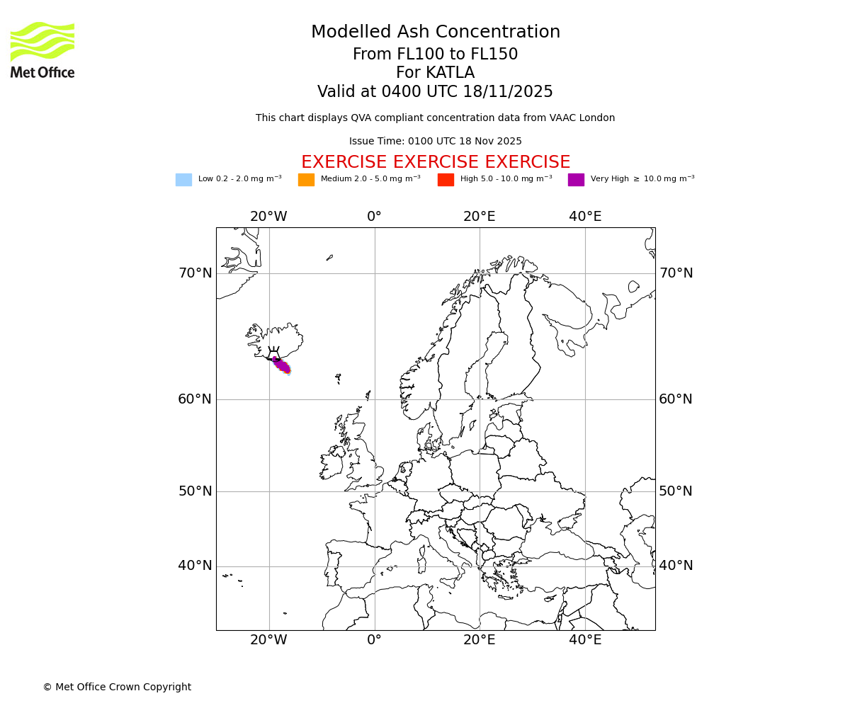 Modelled ash concentration from 100 to 150 for KATLA. Valid at 0100 UTC 18/11/2025