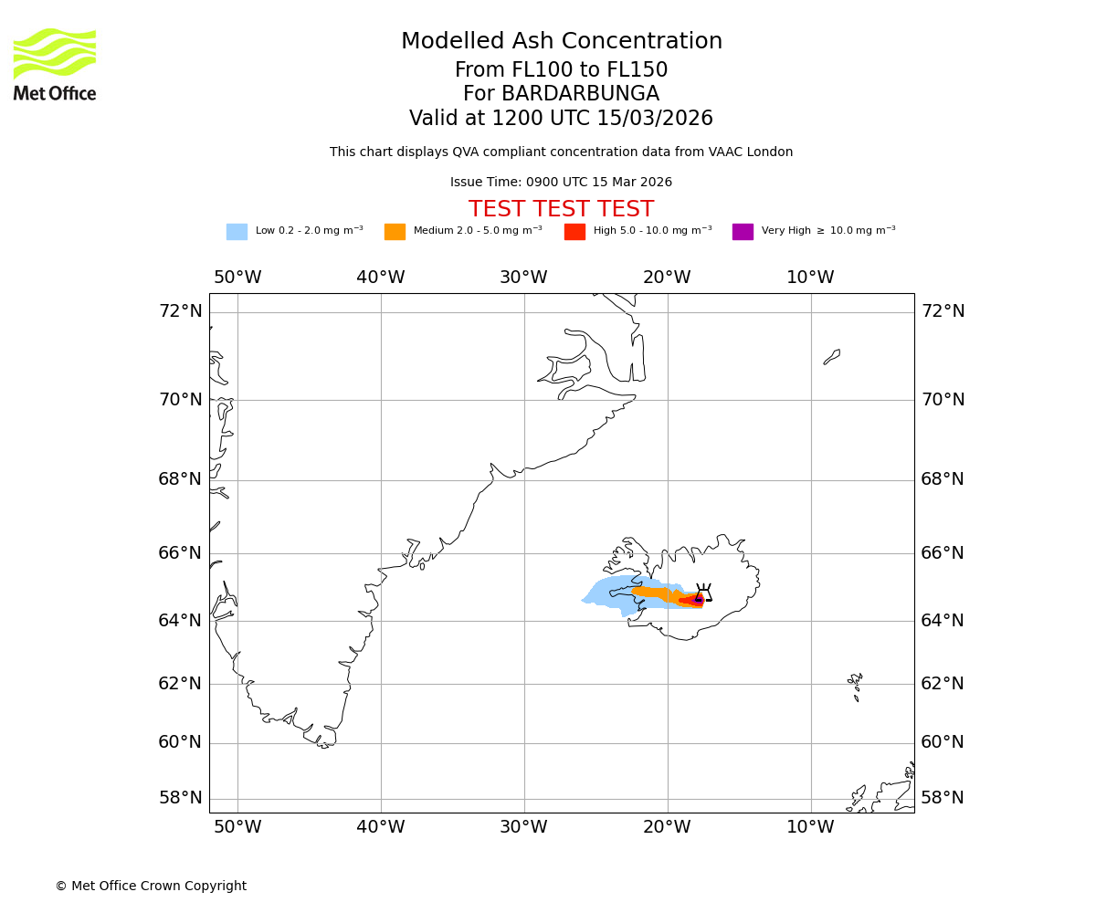 Modelled ash concentration from 100 to 150 for BARDARBUNGA. Valid at 0900 UTC 15/03/2026