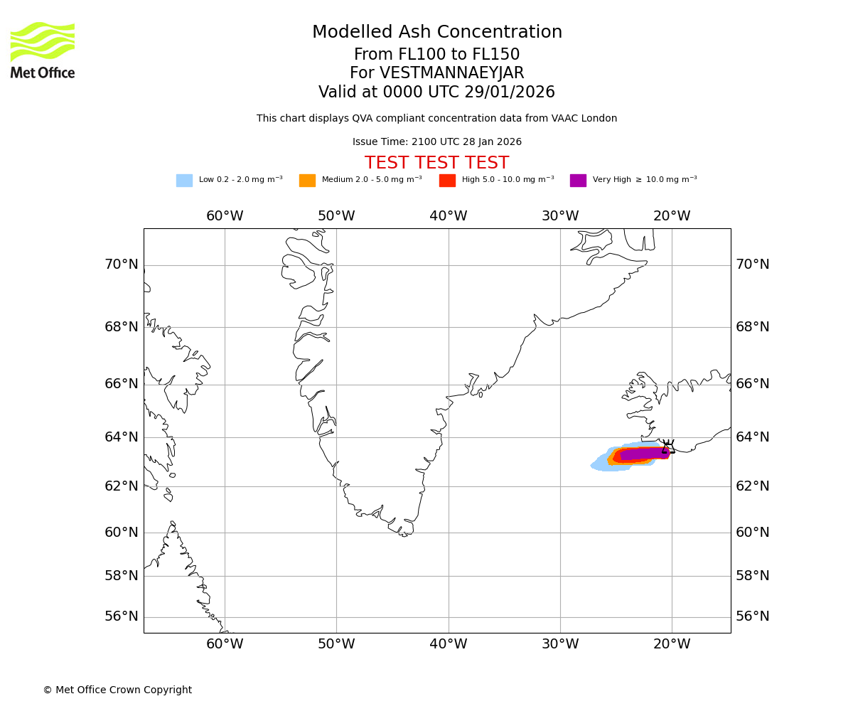 Modelled ash concentration from 100 to 150 for VESTMANNAEYJAR. Valid at 2100 UTC 28/01/2026