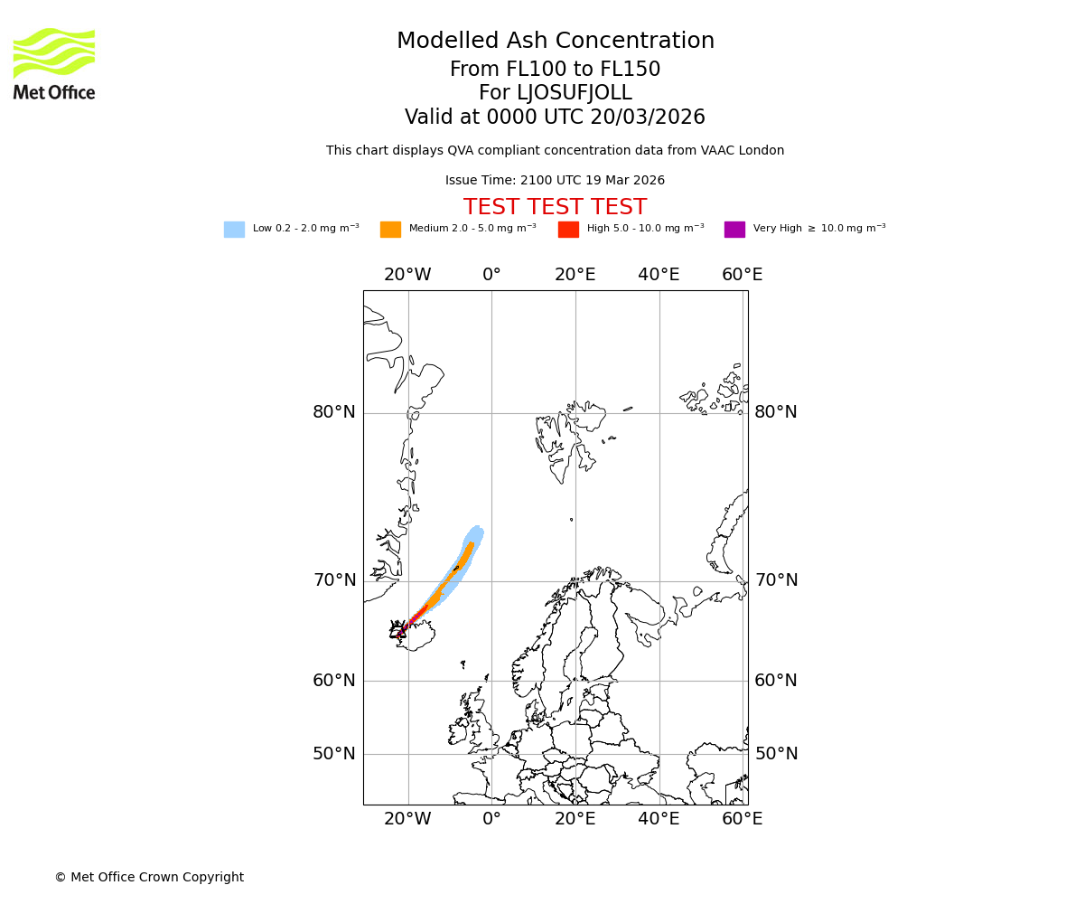 Modelled ash concentration from 100 to 150 for LJOSUFJOLL. Valid at 2100 UTC 19/03/2026