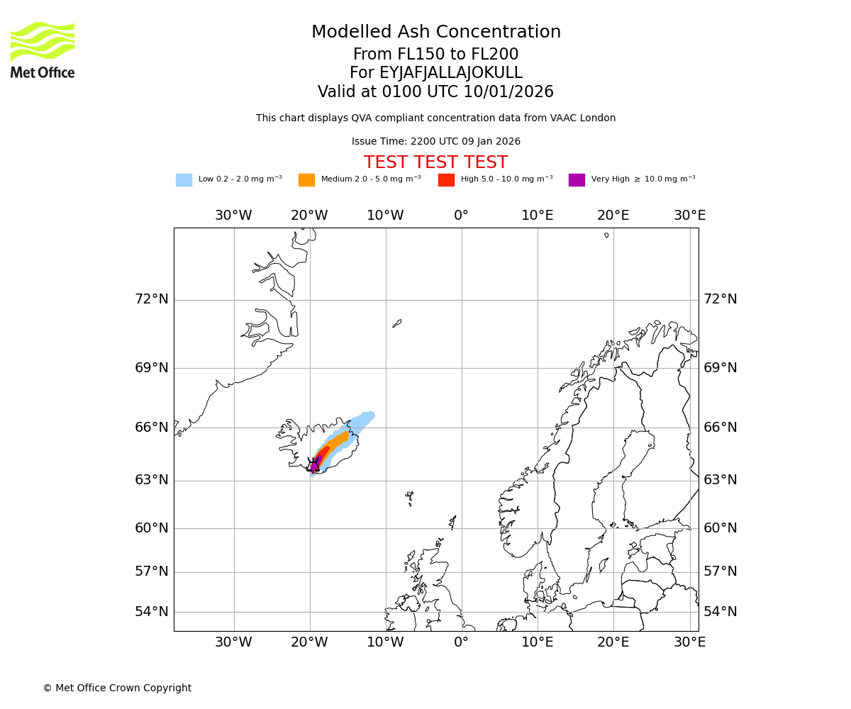 Modelled ash concentration from 150 to 200 for EYJAFJALLAJOKULL. Valid at 2200 UTC 09/01/2026