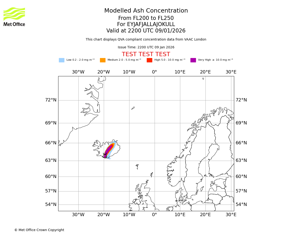 Modelled ash concentration from 000 to 200 for EYJAFJALLAJOKULL. Valid at 2200 UTC 09/01/2026