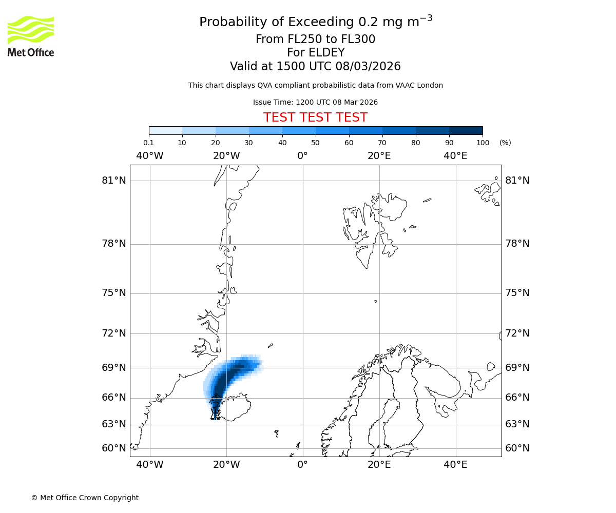 Modelled ash concentration from 000 to 200 for ELDEY. Valid at 1200 UTC 08/03/2026