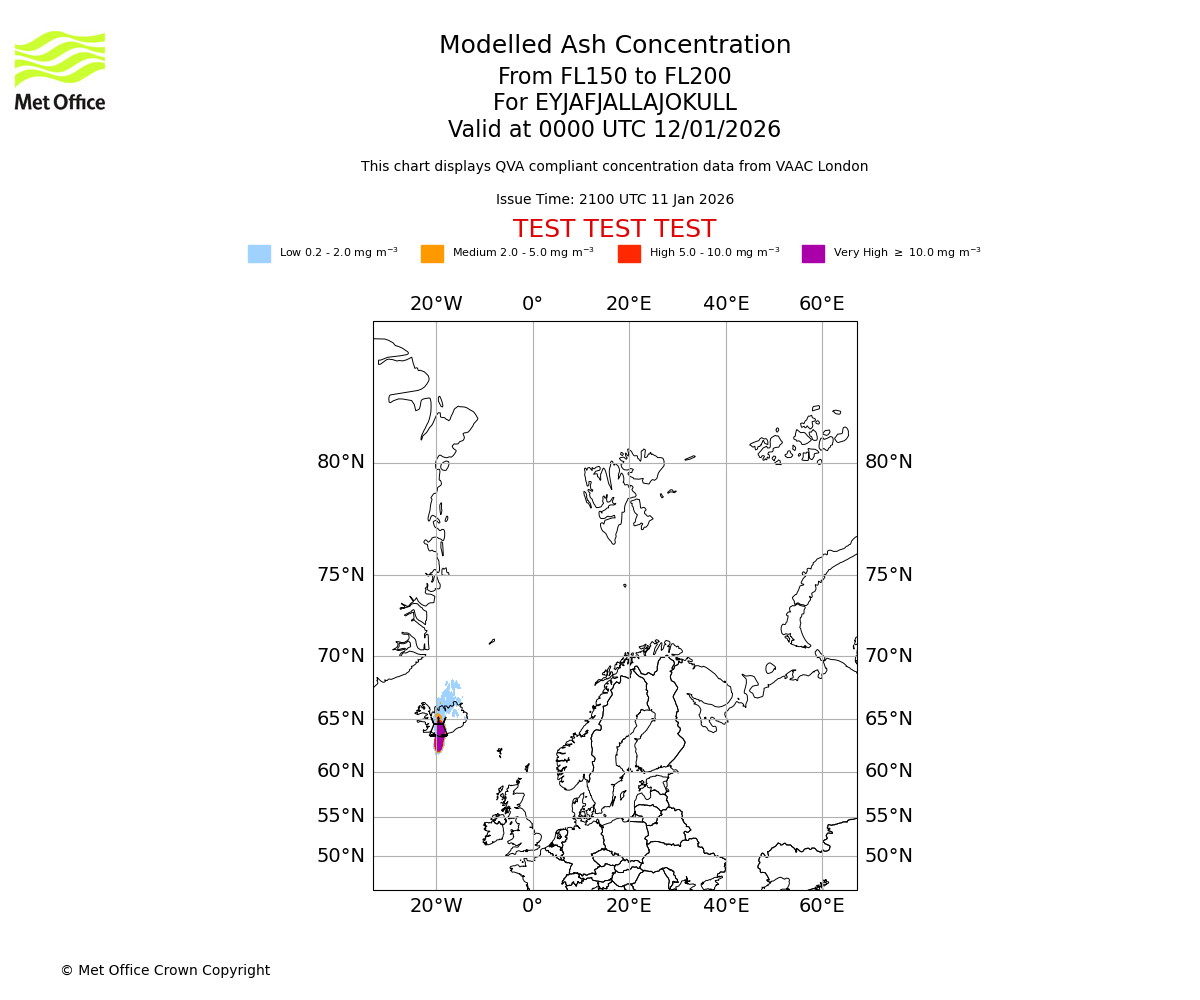 Modelled ash concentration from 150 to 200 for EYJAFJALLAJOKULL. Valid at 2100 UTC 11/01/2026
