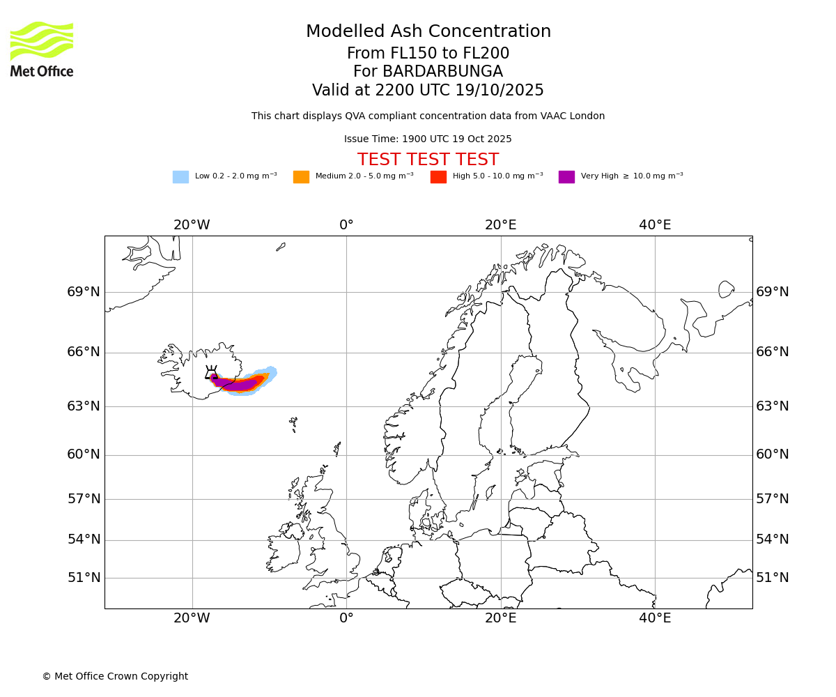 Modelled ash concentration from 150 to 200 for BARDARBUNGA. Valid at 1900 UTC 19/10/2025
