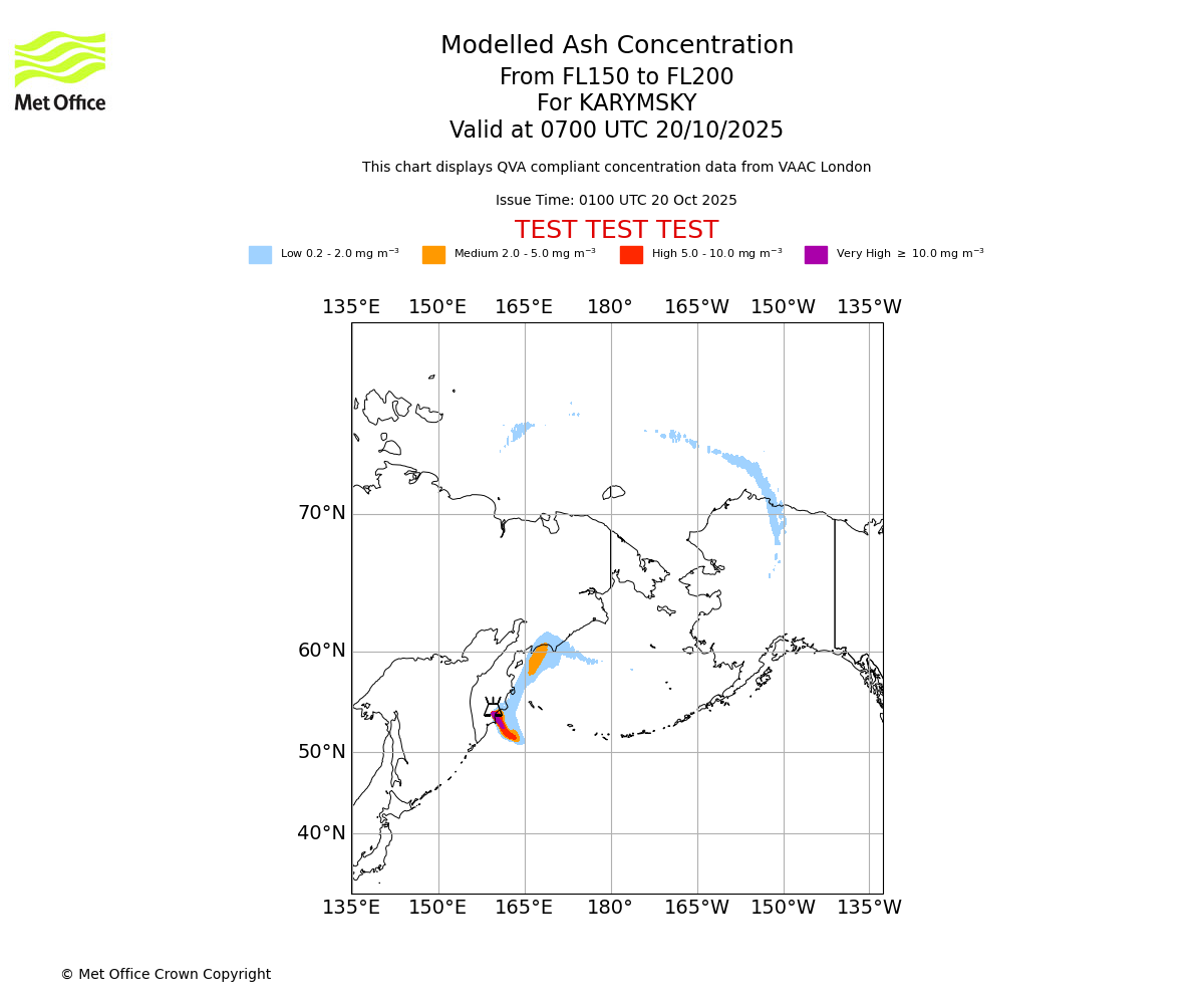 Modelled ash concentration from 150 to 200 for KARYMSKY. Valid at 0400 UTC 20/10/2025