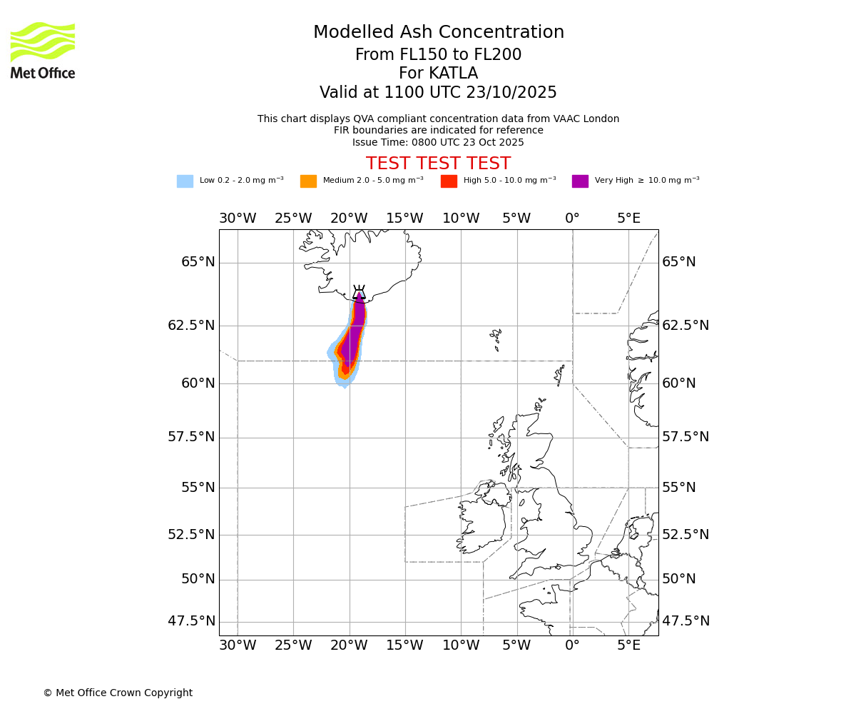 Modelled ash concentration from 150 to 200 for KATLA. Valid at 0800 UTC 23/10/2025
