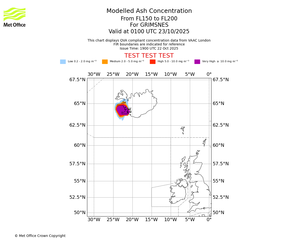 Modelled ash concentration from 150 to 200 for GRIMSNES. Valid at 2200 UTC 22/10/2025