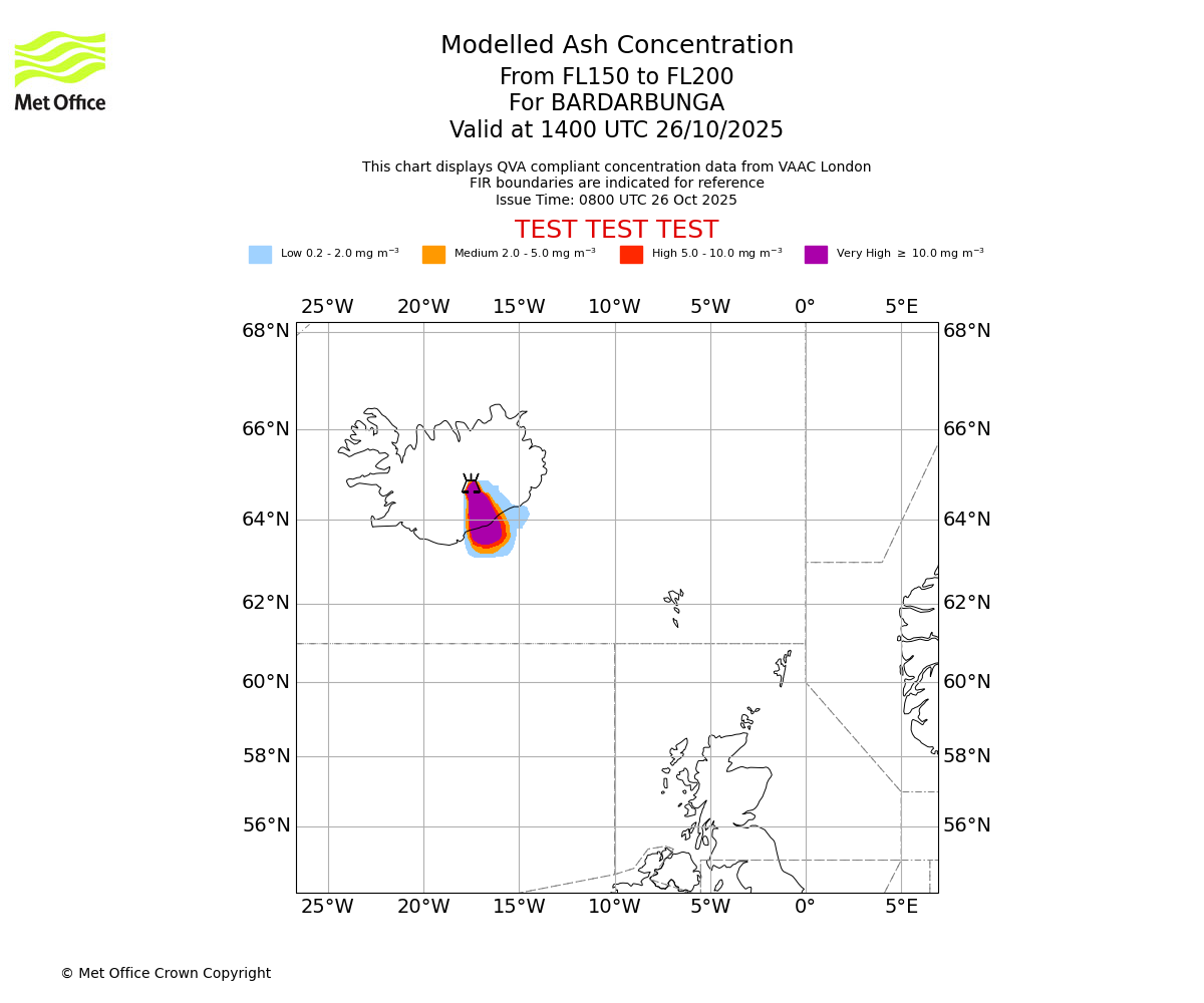 Modelled ash concentration from 150 to 200 for BARDARBUNGA. Valid at 1100 UTC 26/10/2025