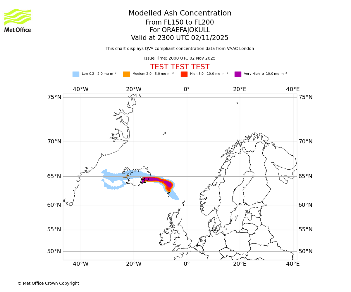 Modelled ash concentration from 150 to 200 for ORAEFAJOKULL. Valid at 2000 UTC 02/11/2025