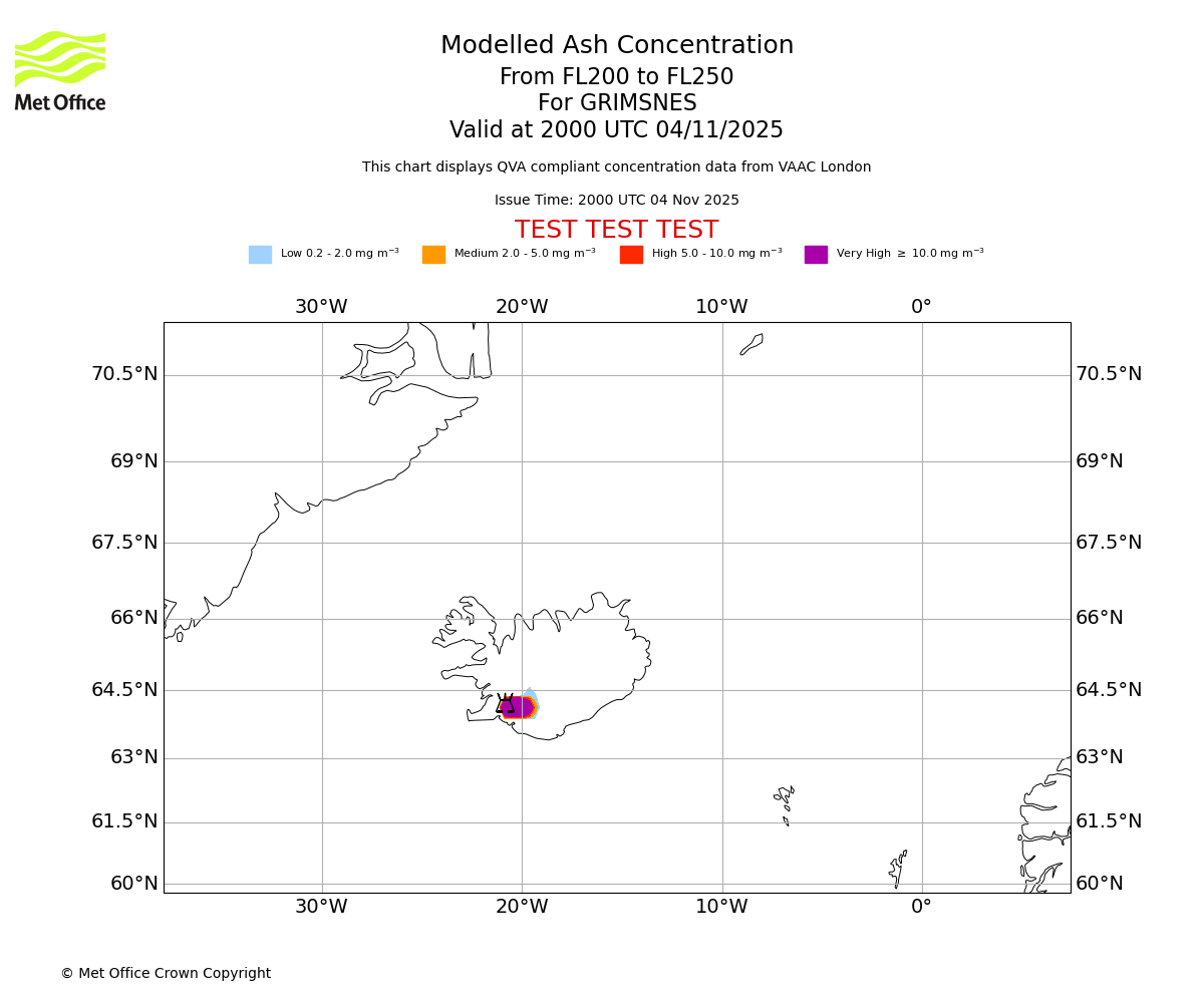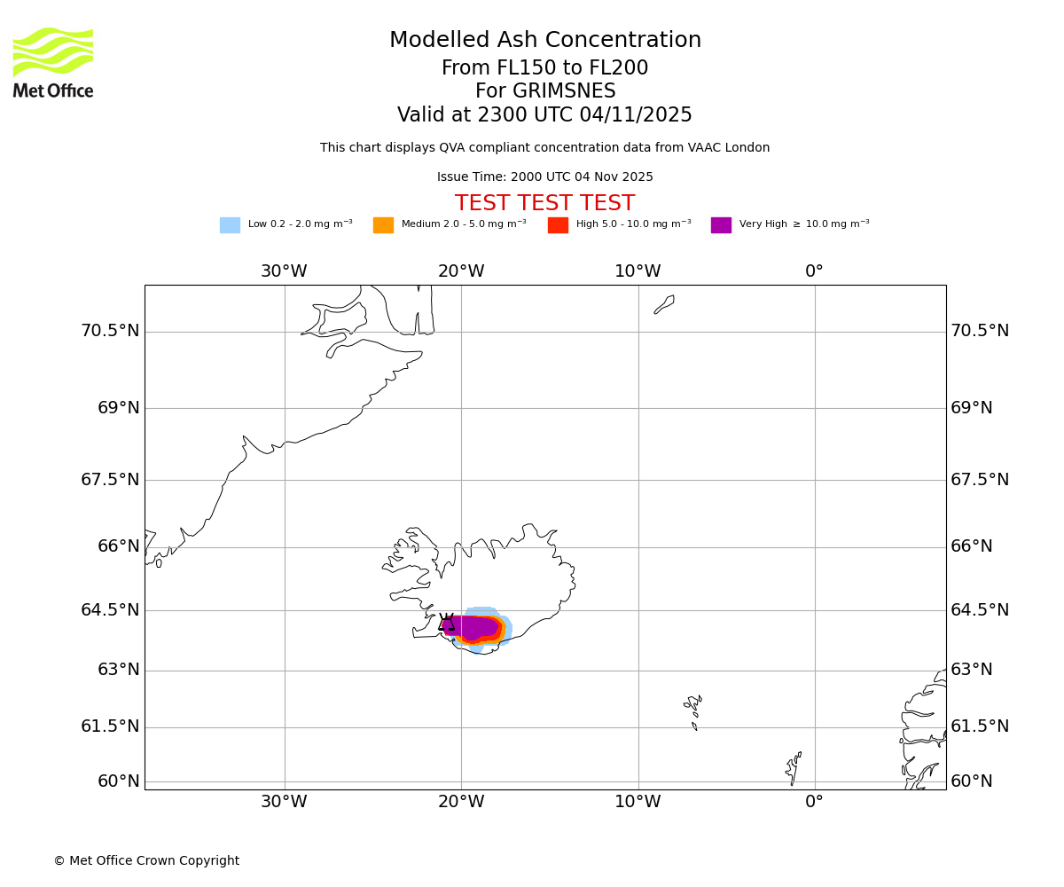In accordance with ICAO Annex 3, Amendment 82 VAAC London will provide operational QVA forecasts from 27 November 2025 and these will be made available via a VAAC London QVA API information service. These charts are currently provided for test and evaluation purposes (not for operational use) until the introduction of the operational service.