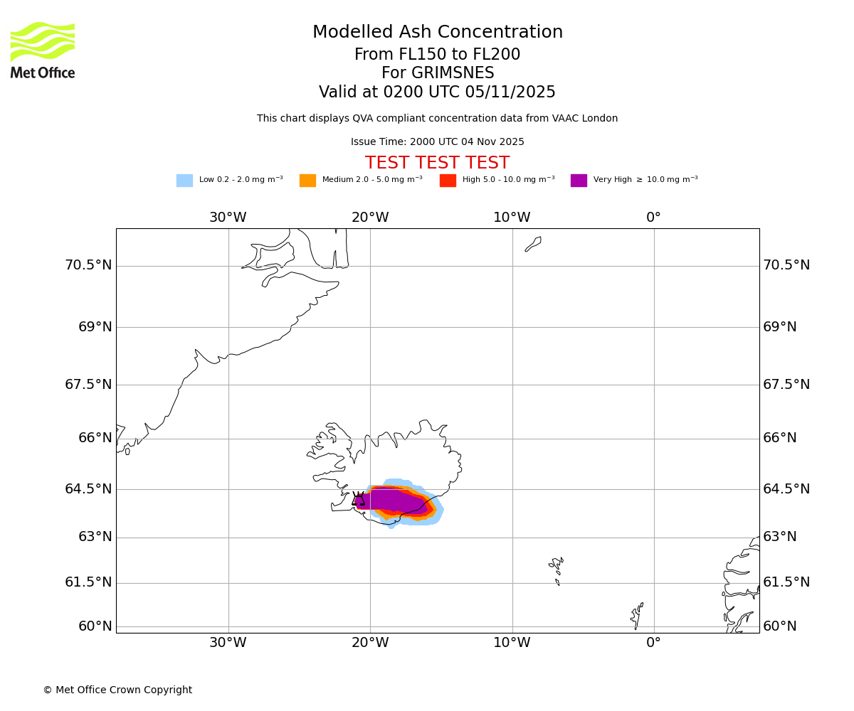 In accordance with ICAO Annex 3, Amendment 82 VAAC London will provide operational QVA forecasts from 27 November 2025 and these will be made available via a VAAC London QVA API information service. These charts are currently provided for test and evaluation purposes (not for operational use) until the introduction of the operational service.