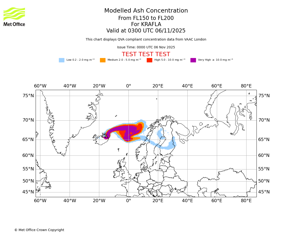 In accordance with ICAO Annex 3, Amendment 82 VAAC London will provide operational QVA forecasts from 27 November 2025 and these will be made available via a VAAC London QVA API information service. These charts are currently provided for test and evaluation purposes (not for operational use) until the introduction of the operational service.
