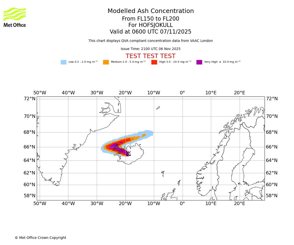 Modelled ash concentration from 150 to 200 for HOFSJOKULL. Valid at 0300 UTC 07/11/2025
